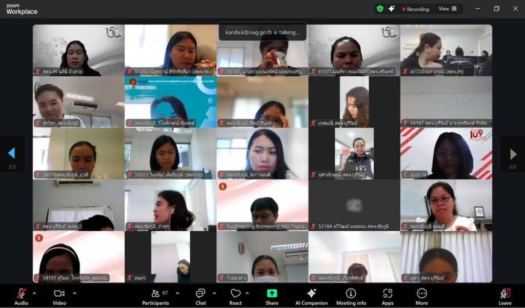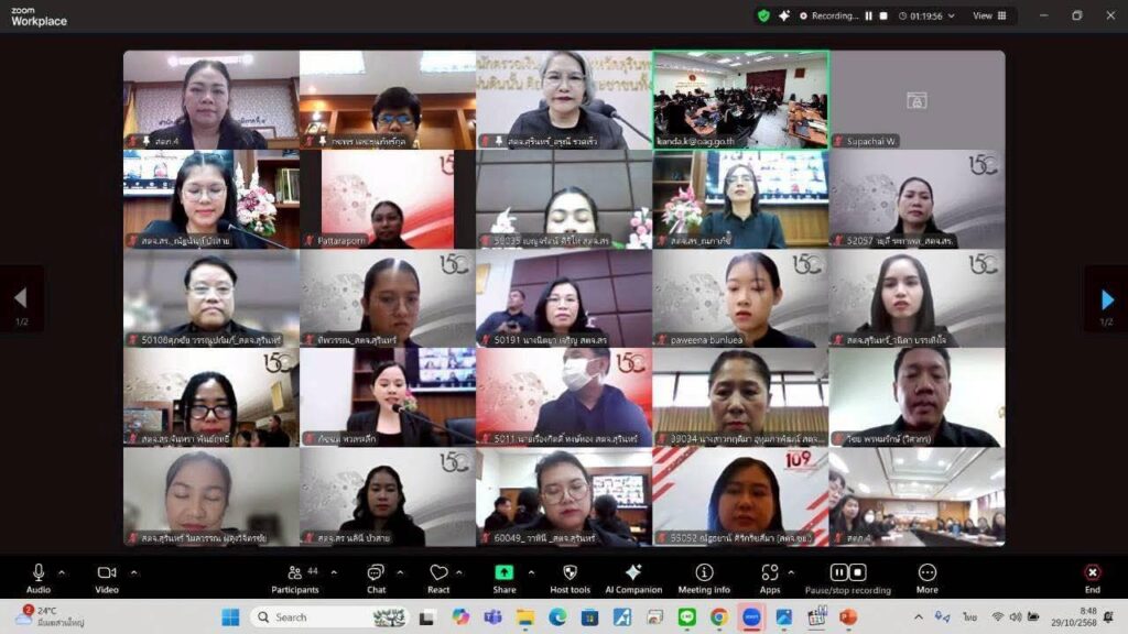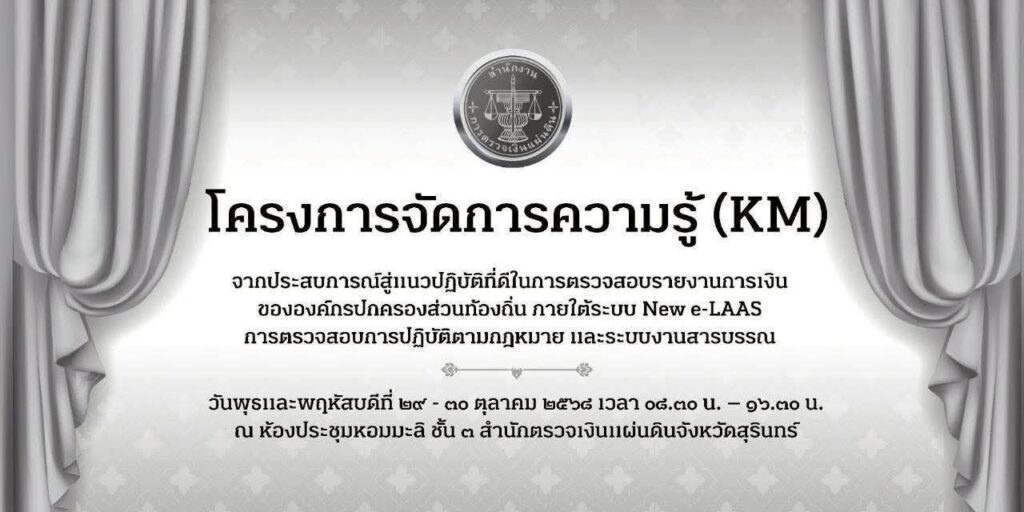 สำนักตรวจเงินแผ่นดินจังหวัดสุรินทร์ นำโดยนางสาวอรุณี รวดเร็ว ผู้อำนวยการสำนักตรวจเงินแผ่นดินจังหวัดสุรินทร์ ได้รับอนุมัติจากผู้ตรวจเงินแผ่นดิน (สตภ.๔) ให้จัดโครงการจัดการความรู้ KM หัวข้อ “จากประสบการณ์สู่แนวปฏิบัติที่ดี ในการตรวจสอบรายงานทางการเงินขององค์กรปกครองส่วนท้องถิ่น ภายใต้ระบบ New e-LAAS การตรวจสอบการปฏิบัติตามกฎหมายและระบบงานสารบรรณ” ในวันที่ ๒๙-๓๐ ตุลาคม ๒๕๖๘ ซึ่งเป็นการจัดโครงการในรูปแบบผสมผสาน ทั้งระบบ On-site ณ ห้องประชุมหอมมะลิ สตจ.สุรินทร์ และทาง Online ถ่ายทอดผ่านระบบ Zoom โดยมีผู้เข้าร่วมโครงการจาก สตจ.นครรสีมา สตจ.บุรีรัมย์ และ สตจ.ชัยภูมิ เพื่อแลกเปลี่ยนเรียนรู้ร่วมกัน